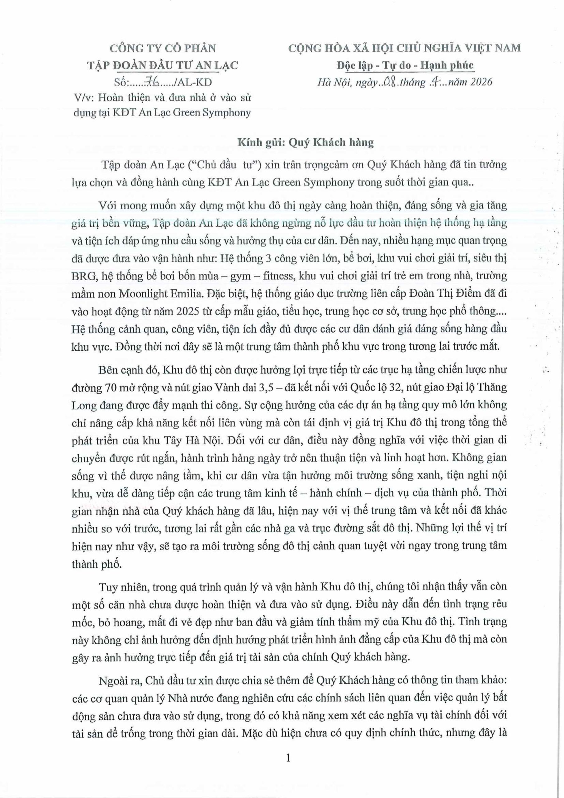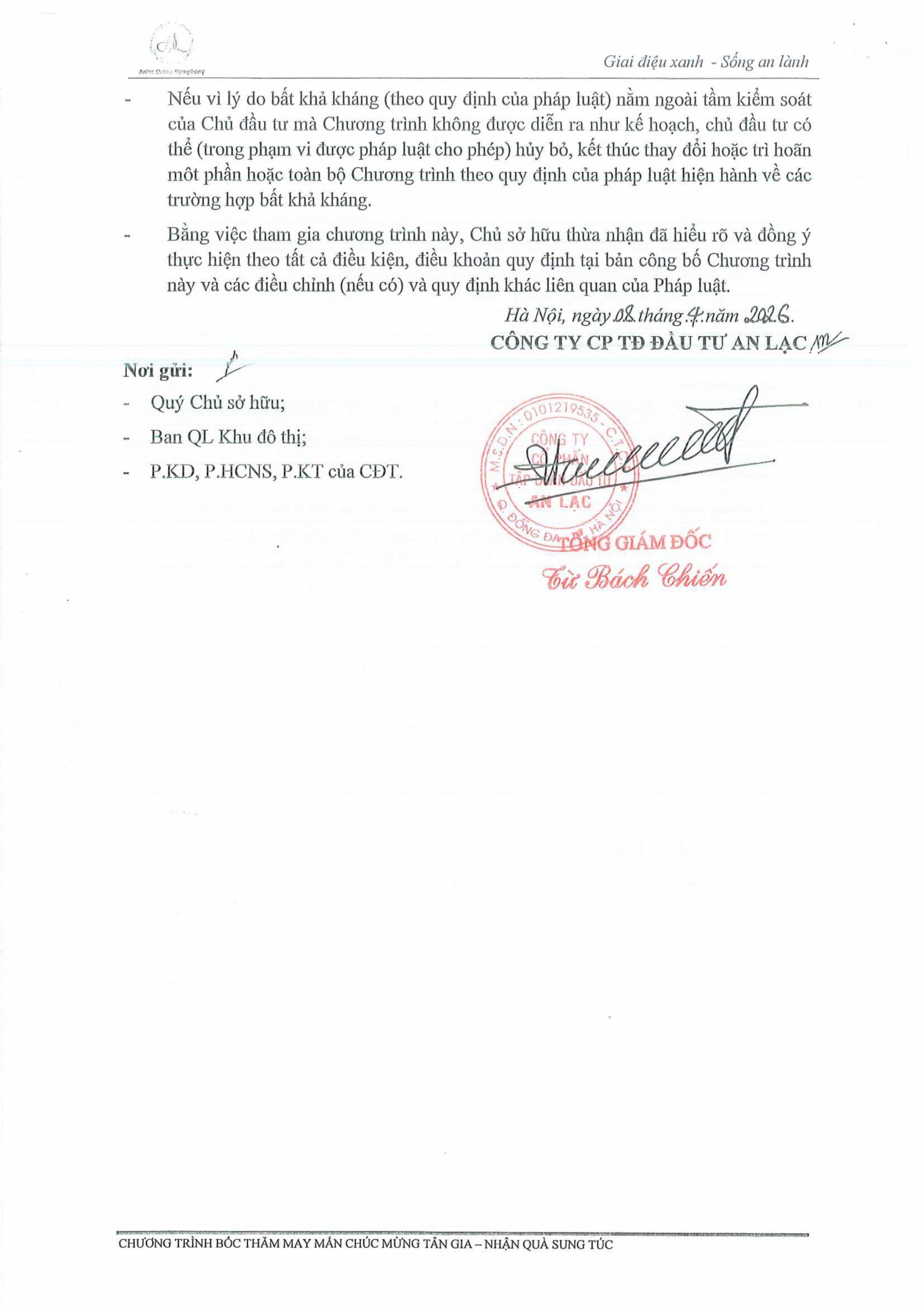 Đây là hoạt động tri ân thiết thực mà Chủ đầu tư dành tới Quý Khách hàng đã lựa chọn Anlac Green Symphony là nơi an cư, khởi đầu cho một cuộc sống mới trọn vẹn giữa không gian sống xanh, tiện nghi, đồng bộ và cộng đồng cư dân văn minh, đẳng cấp. Tập đoàn An Lạc trân trọng mời Quý Khách hàng sớm hoàn thiện tổ ấm, trở về sinh sống để vừa tận hưởng những giá trị sống khác biệt tại Anlac Green Symphony, vừa có cơ hội tham gia chương trình bốc thăm may mắn với những quà tặng ý nghĩa như một lời chúc mừng cho hành trình an cư sung túc, đủ đầy.